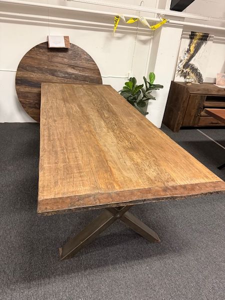 Et stort og langt plankebord i genbrugstræ med rå jernkanter og understel af jern. Bordet kan samle den helt store familie eller selskab, men vil også være et lækkert bud på et cool mødebord.