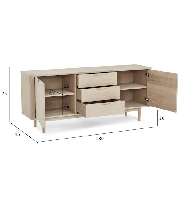 Denne skænk kombinerer robusthed og elegance med sit materiale i massivt træ, egetræsfiner og MDF, alle behandlet med hvidpigmenteret olie. Skænken har to låger, tre skuffer og to justerbare træhylder (18 mm), der giver god opbevaringsplads. De fræsede greb og soft-close system sikrer et stilrent udtryk og lydløs lukning. Skænken står på 20 cm høje ben.