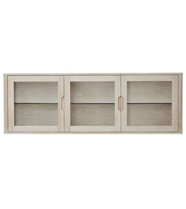 Møblet er udstyret med tre låger og tre justerbare hylder, som giver fleksibel opbevaringsplads til både service, dekoration og andre genstande.