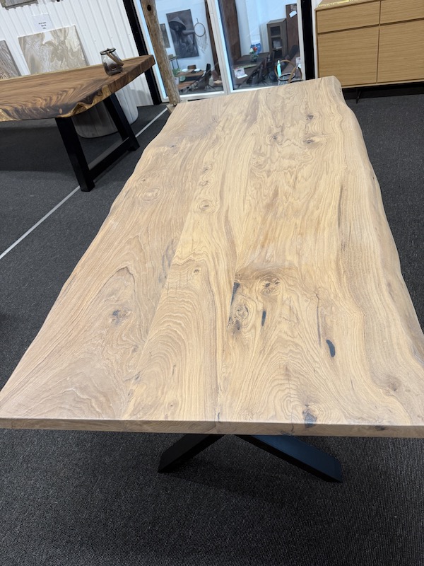 Træets karakteristiske årringe og naturens unikke mønstre giver hvert enkelt møbel et unikt udseende, ofte med synlige knaster og strukturer, der tilføjer rustik charme.