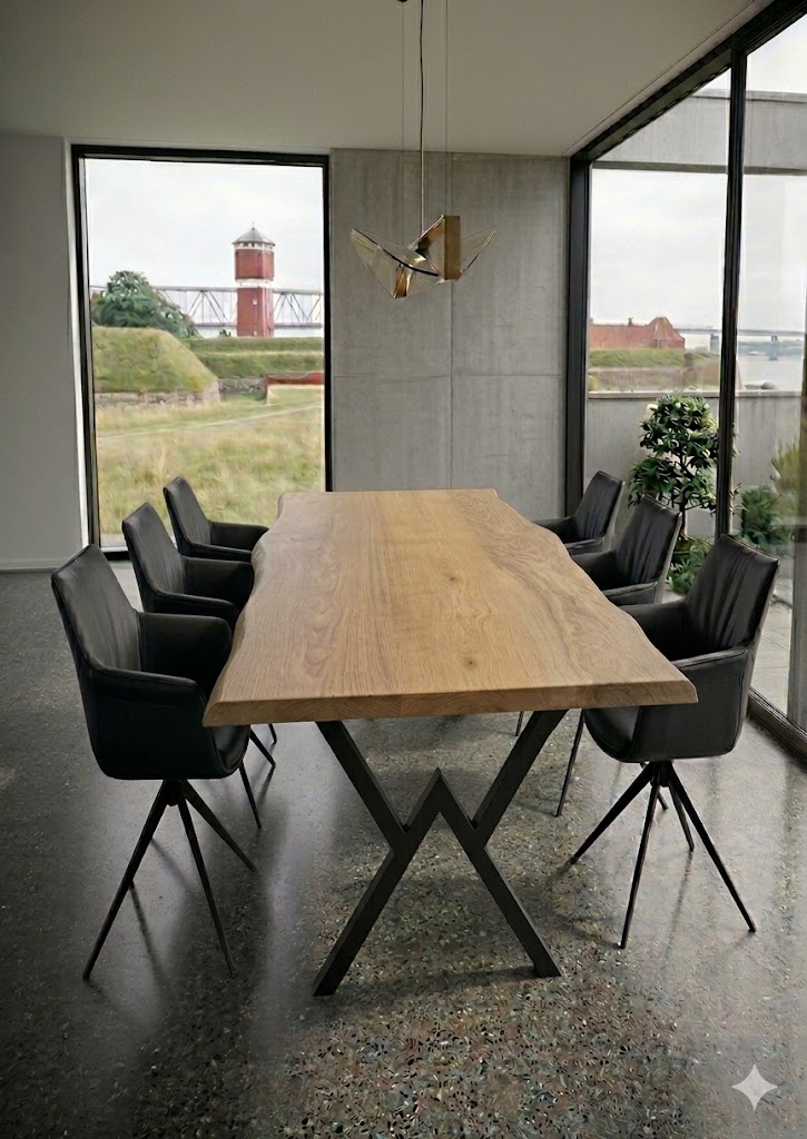 Dette bord forener det klassiske egetræ med et moderne, arkitektonisk udtryk.