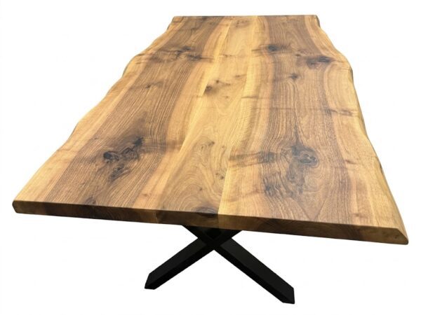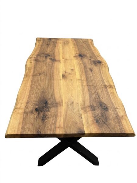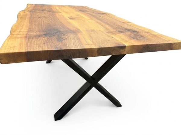 Bordet kombinerer den dybe, varme glød fra valnøddetræet med et råt, industrielt look fra de markante X-ben.