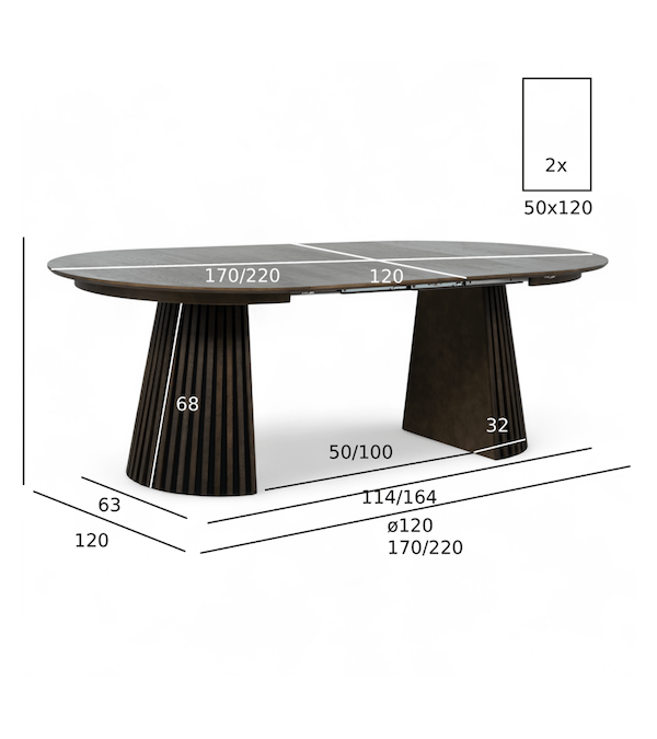 Med den innovative synkroniserede udtræksfunktion kan du nemt forlænge bordet til 170 cm eller 220 cm ved hjælp af de medfølgende forlængerbrædder – ideelt til både hverdagsmiddage og større selskaber.