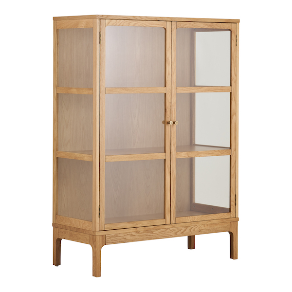 Det naturlige trælook tilfører varme og ro til indretningen, mens glasset giver et let og moderne udtryk. Kombinationen af solide materialer og tidløst design gør vitrineskabet velegnet til både stue, spisestue eller køkken.